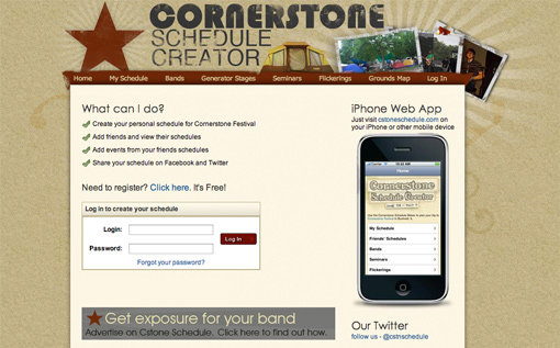 Created to help attendees of Cornerstone Music Festival plan out their week. The initial code was written overnight, and then the design was updated and tweaked with primary artwork from David Hechler. The second year, the site had a mobile version, an interactive grounds map, audio clips of artists, and links to iTunes.